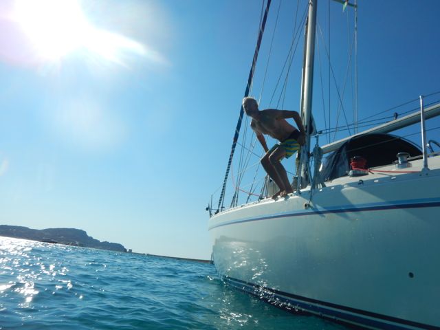 Bonifacio is a special place. You enter the Port through a tiny vertical spilt in the cliffs. Once inside it is a busy, no, very busy port. We arrived at lunchtime. There were cruise ships, ferries, tour boats, 150ft super yachts, and lots of other yachts and motor boats coming at us from every direction. We called up on the radio and in Heather’s perfect French organized a berth on the visitors wharf. We found our pontoon, but couldn’t get to it for all the traffic. A charter yacht hit a wall in front of us and I ended up in a holding pattern while he assessed the damage all the time dodging big ferries coming past at 10kts. A surreal experience. We kept it together and executed a nice stern to mooring and cracked a beer. The town is staggering, the old town is perched on cliffs 100m up looking down over the port. We restocked the fridge and made a quick exit knowing we’d return in a couple of days to drop off Damian and Helen. After two days at the beautiful Iles Levezzi, Bonifacio had another surprise for us with the cliffs cloaked in fog for our second entrance. Now we were entering a busy port blind. Lifejackets on, fog horn to hand, we slowly motored through the mist, only spotting a yacht when it was 50m off our bow. Luckily the clouds lifted just as we reached the base of the cliffs and we had a less hectic mooring experience this time.